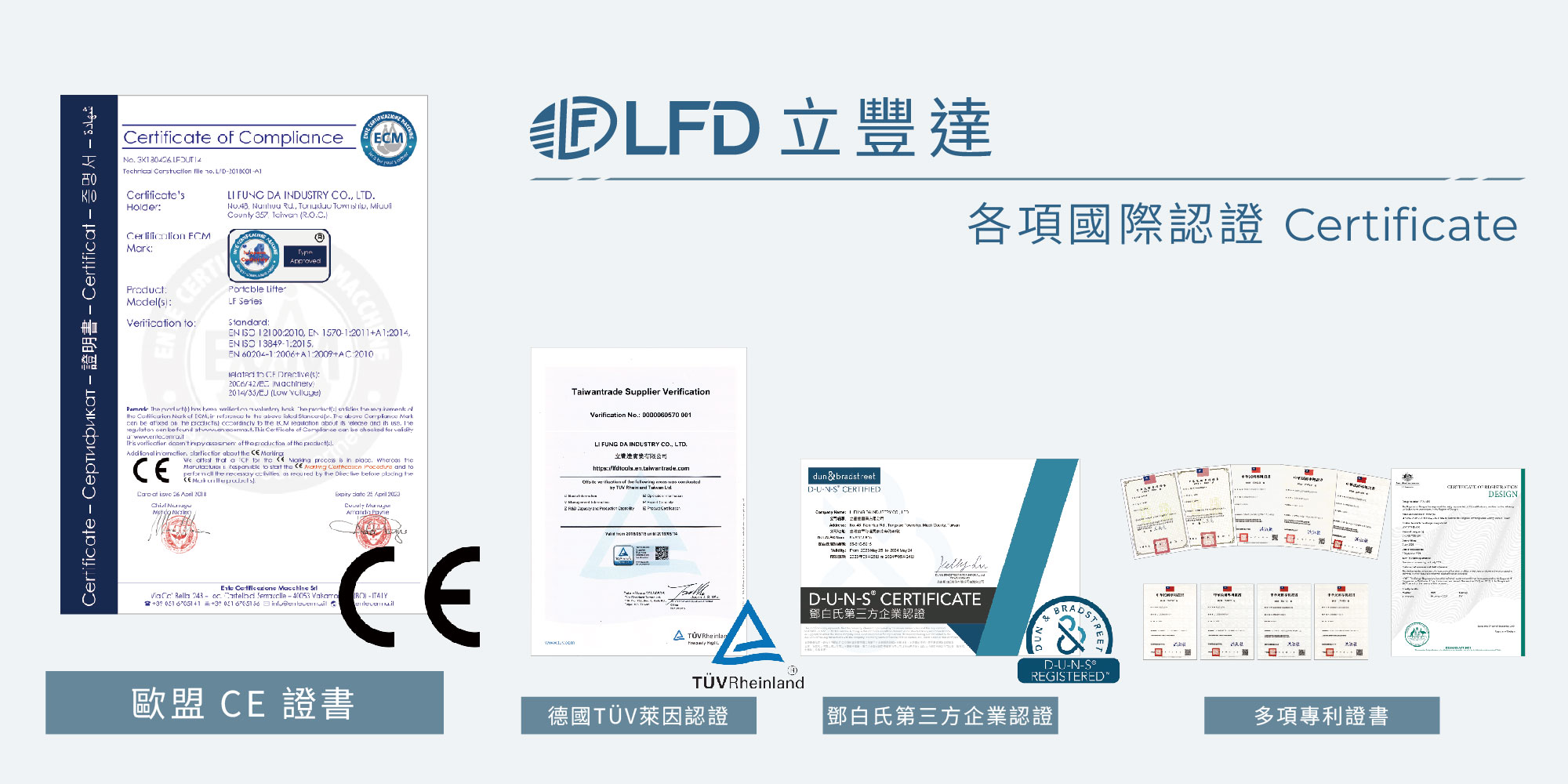 LFD擁有多項國際認證(歐盟CE認證、德國萊因TÜV Rheinland、鄧白氏第三方企業認證)及專利證書,積極拓展海外市場。